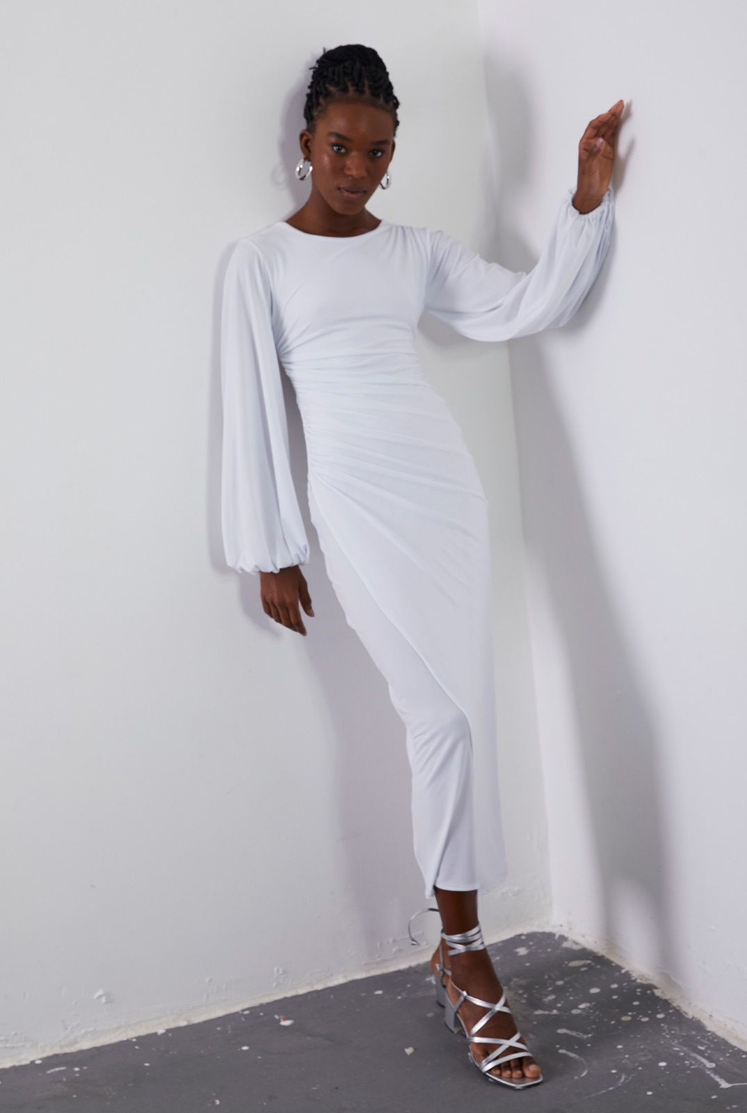 VESTIDO DRAPEADO MANGA BUFANTE DECOTE COSTAS LONGO BRANCO
