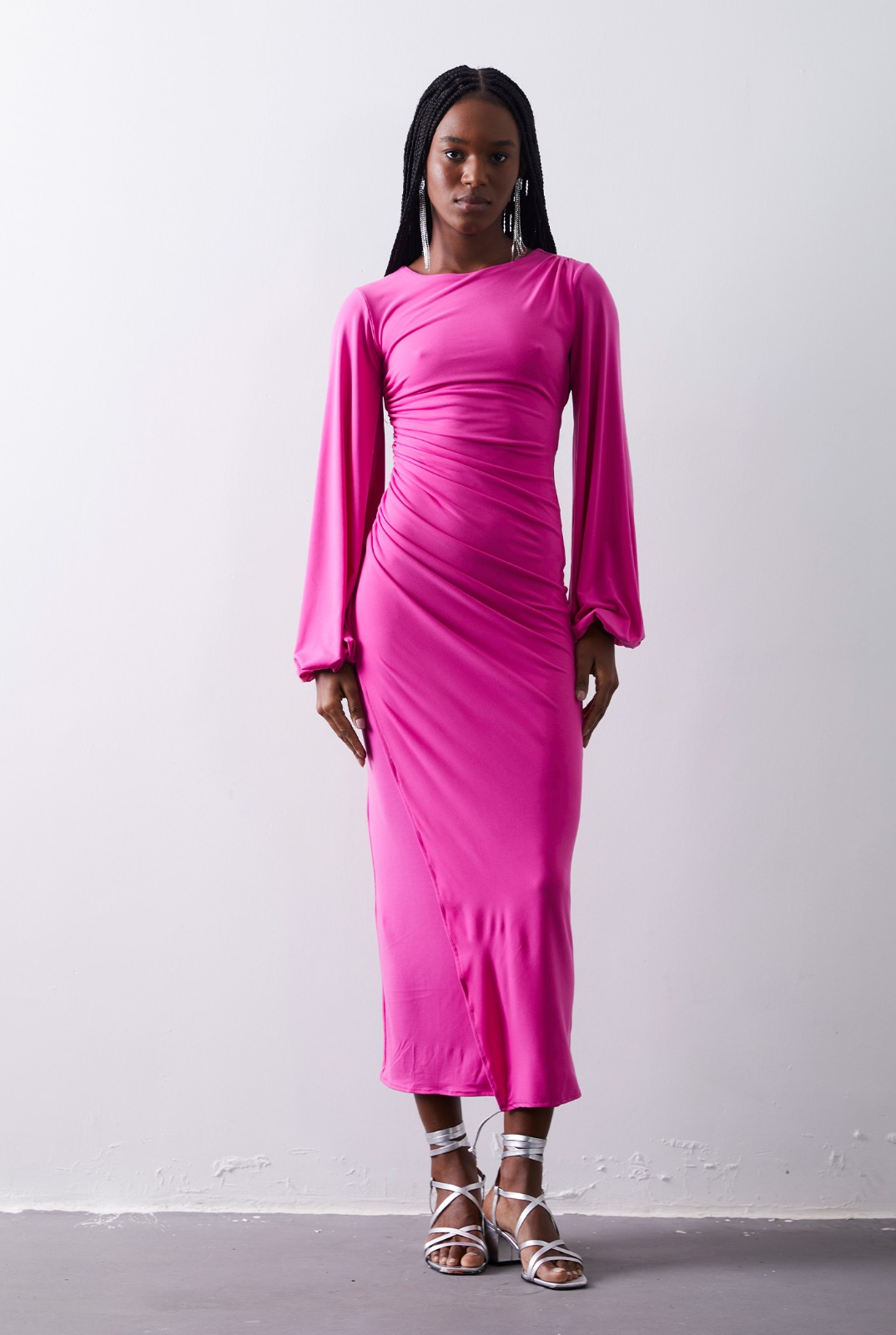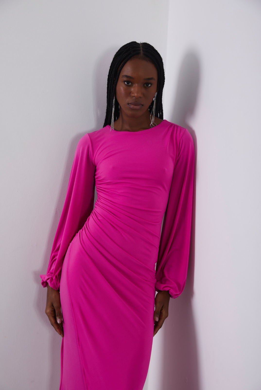 VESTIDO DRAPEADO MANGA BUFANTE DECOTE COSTAS LONGO PINK